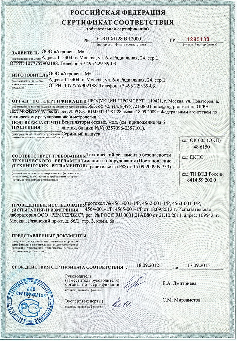 Сертификат соответствия Техническому регламенту о безопасности машин и оборудования. Вентиляторы осевые