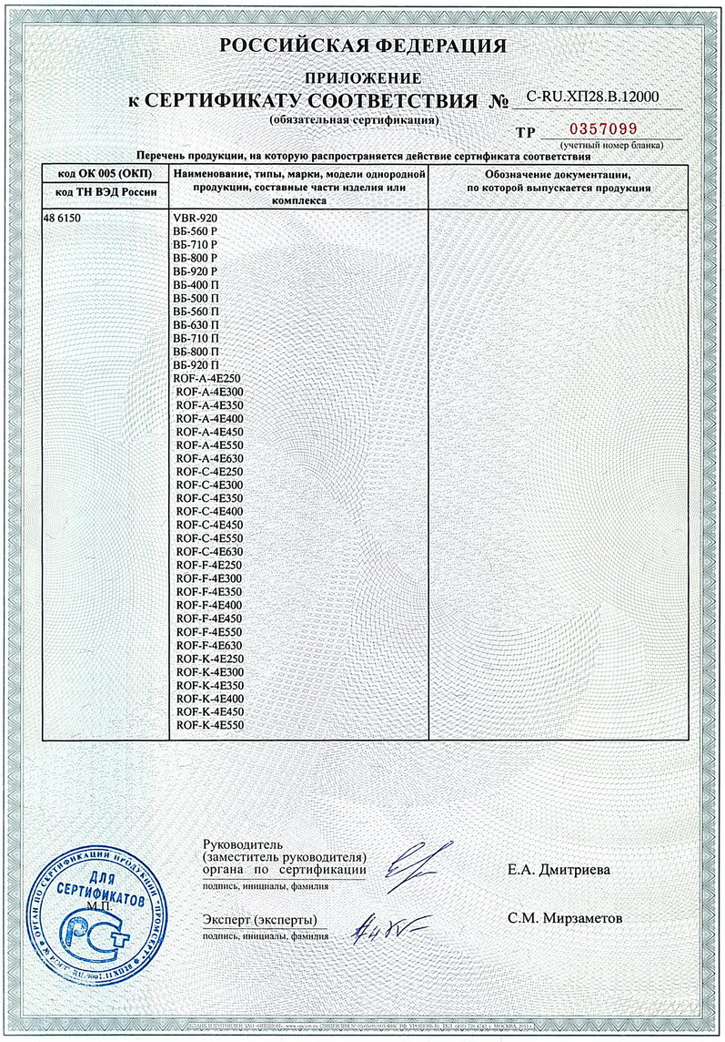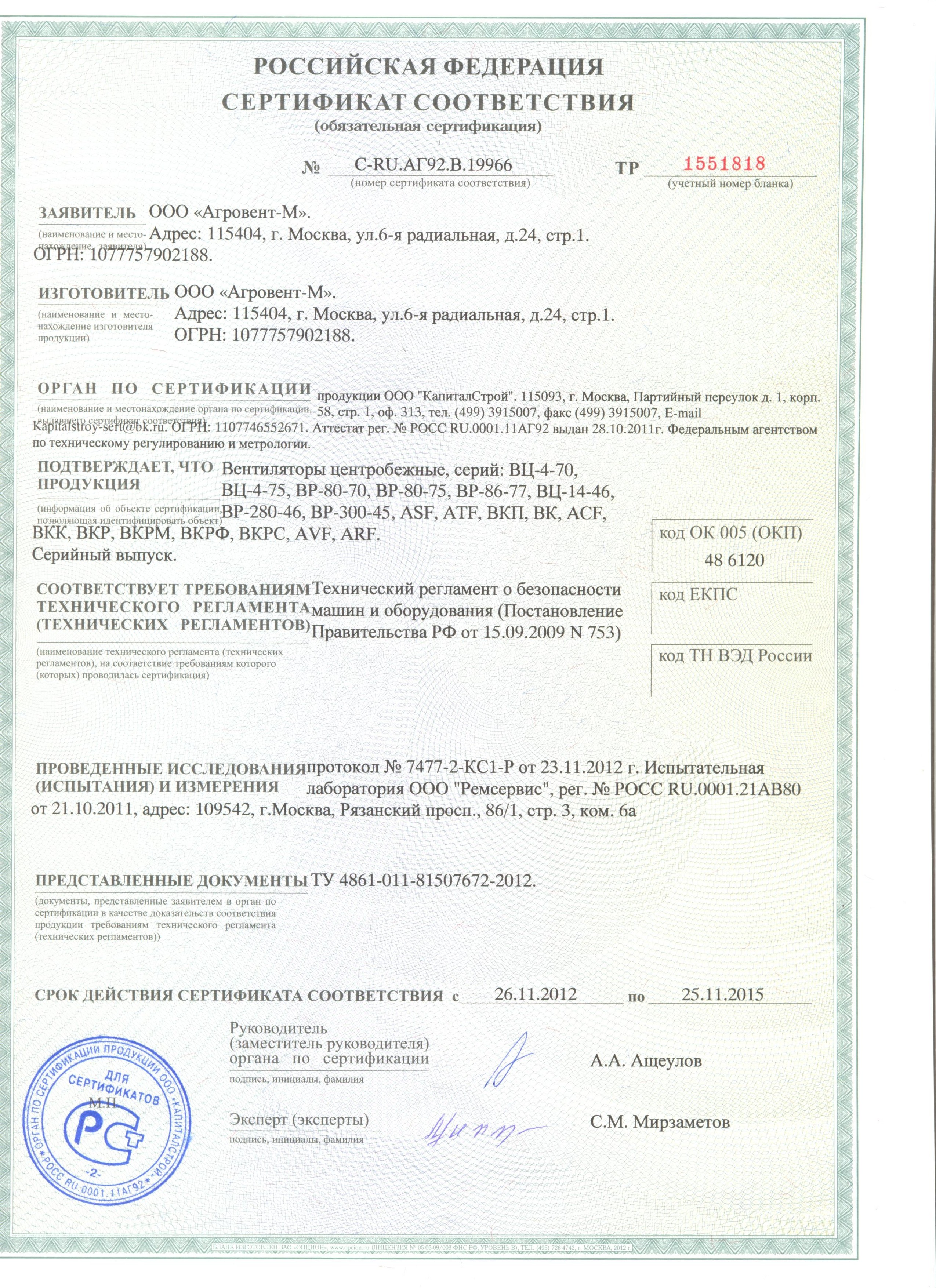 Сертификат соответствия Техническому регламенту о безопасности машин и оборудования. Вентиляторы центробежные