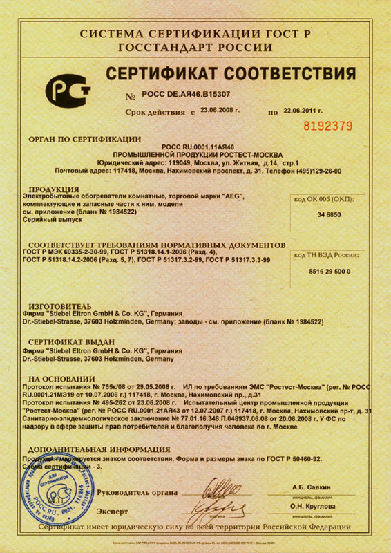 - Сертификат соответствия госстандарта на обогреватели AEG