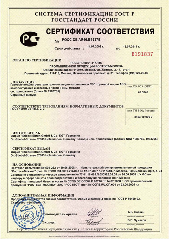 - Сертификат соответствия госстандарта на газовые колонки AEG
