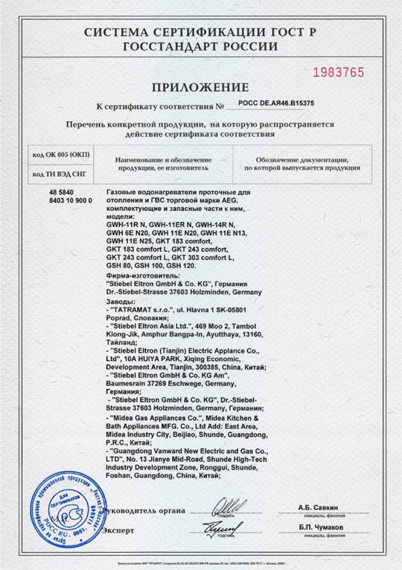 - Сертификат соответствия госстандарта на газовые колонки AEG, прил. 1