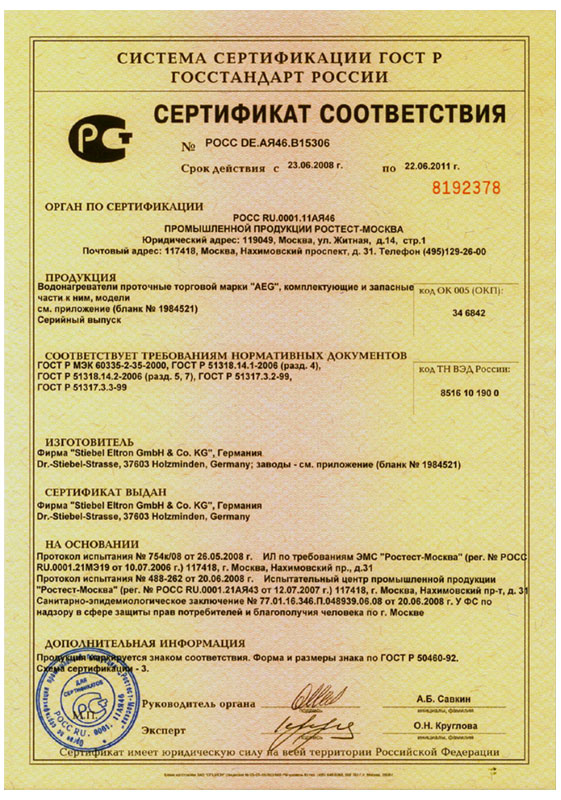- Сертификат соответствия госстандарта на проточные водонагреватели AEG