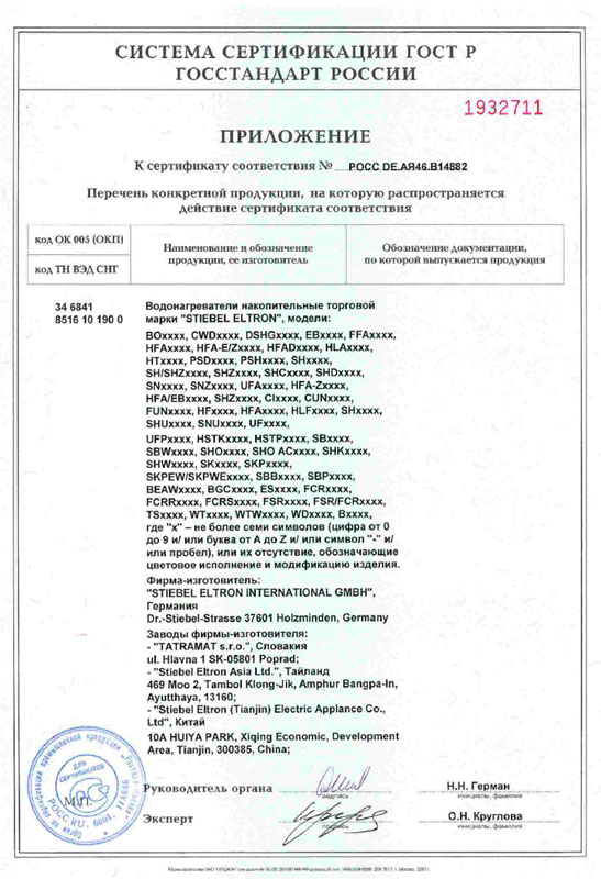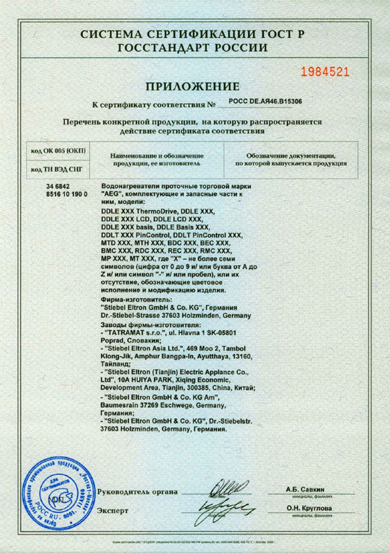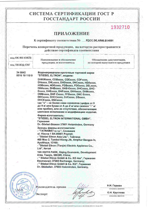 - Сертификат соответствия госстандарта на проточные водонагреватели Stiebel Eltron, прил.