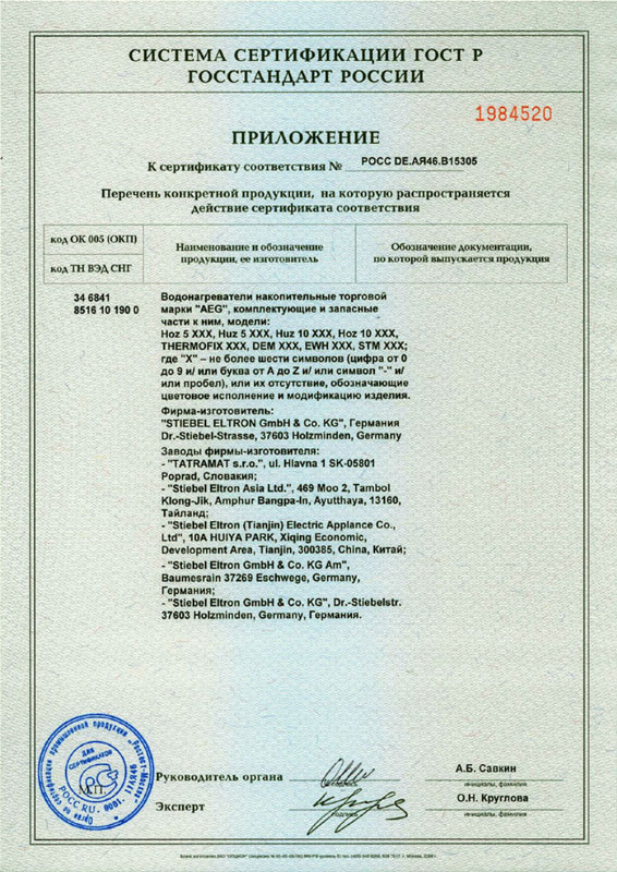 - Сертификат соответствия госстандарта на накопительные водонагреватели AEG, прил.