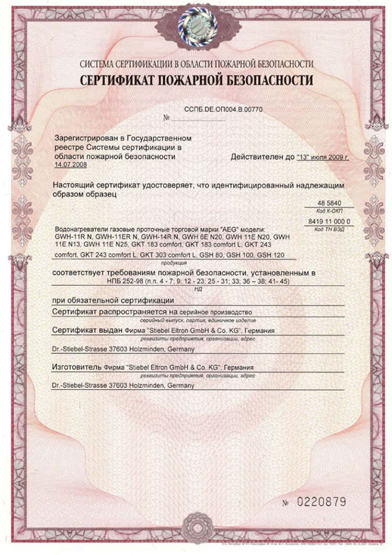- Сертификат пожарной безопасности на газовые колонки AEG