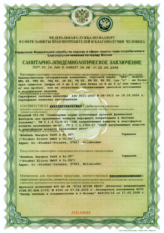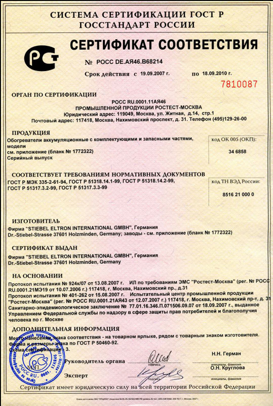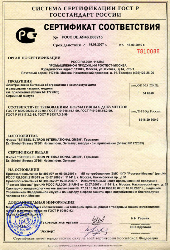 - Сертификат соответствия госстандарта на обогреватели Stiebel Eltron