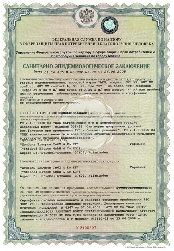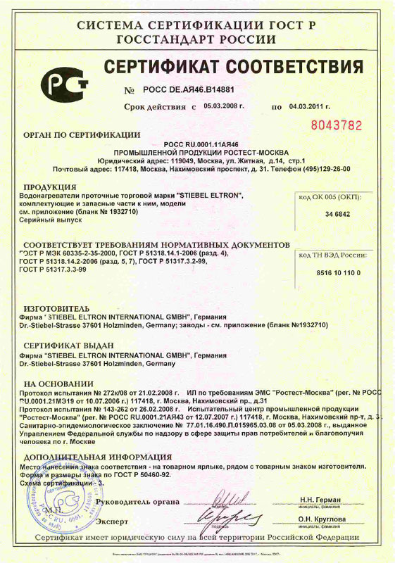 - Сертификат соответствия госстандарта на проточные водонагреватели Stiebel Eltron