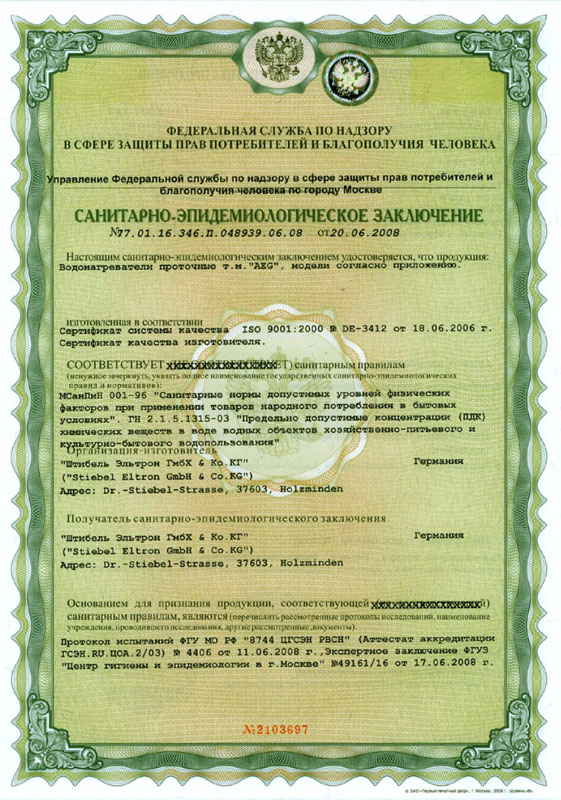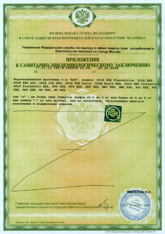 - Санитарно-эпидемиологическое заключение на проточные водонагреватели AEG