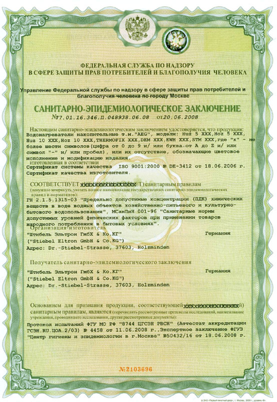 - Санитарно-эпидемиологическое заключение на накопительные водонагреватели AEG