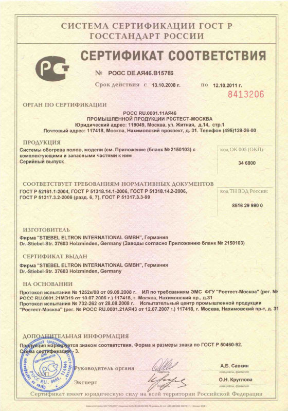 - Сертификат соответствия госстандарта на системы обогрева полов Stiebel Eltron