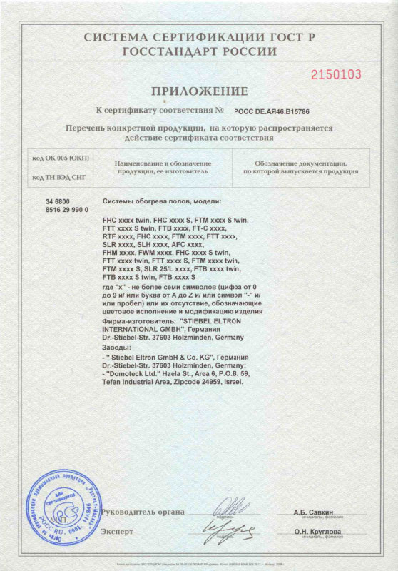 - Сертификат соответствия госстандарта на системы обогрева полов Stiebel Eltron, прил.