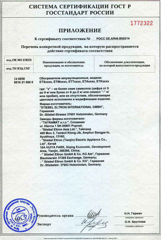 - Сертификат соответствия госстандарта на теплоаккумуляторы Stiebel Eltron, прил.