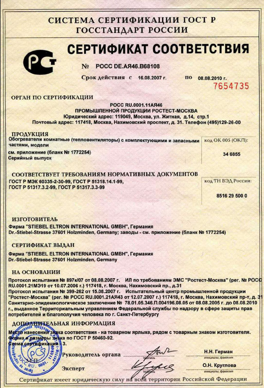 - Сертификат соответствия госстандарта на тепловентиляторы Stiebel Eltron