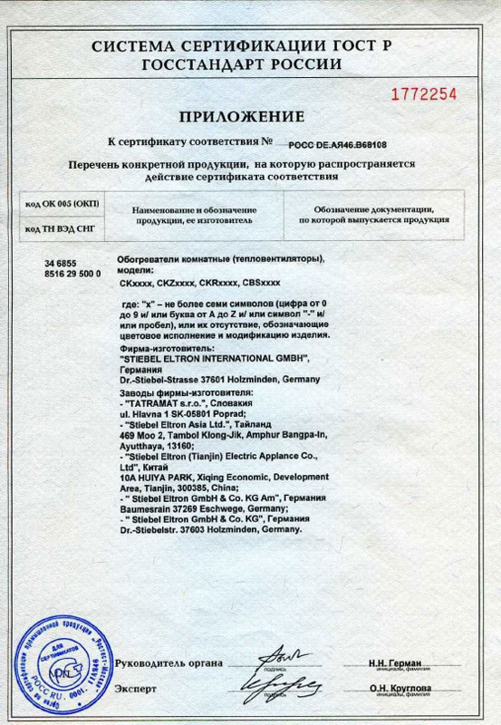 - Сертификат соответствия госстандарта на тепловентиляторы Stiebel Eltron, прил.