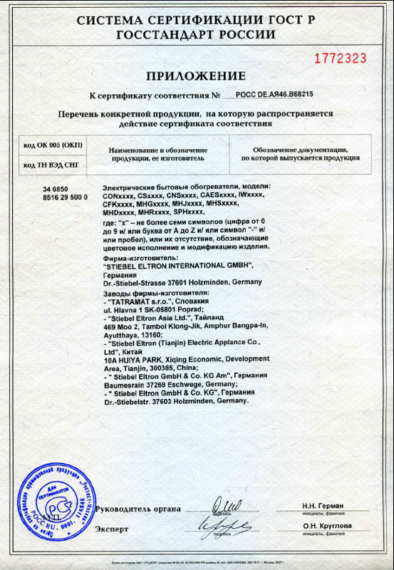- Сертификат соответствия госстандарта на обогреватели Stiebel Eltron, прил.