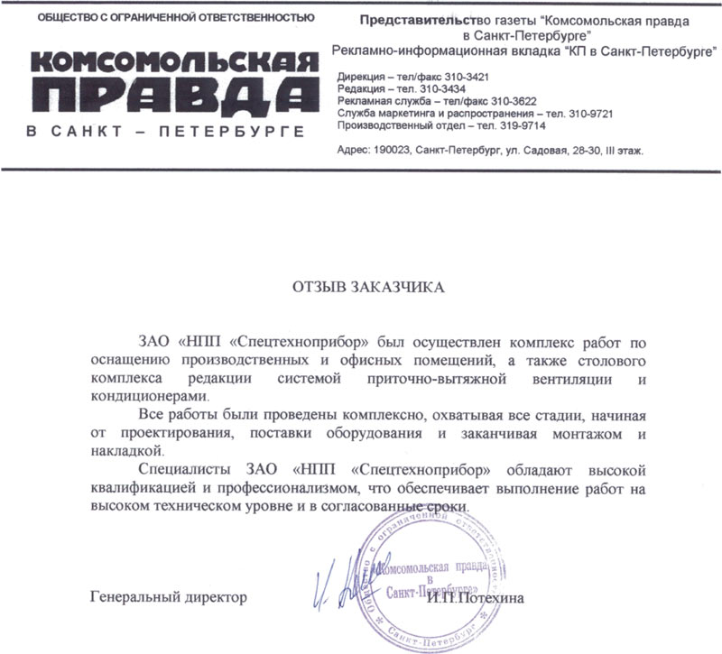 ЗАО «НПП «Спецтехноприбор» был осуществлен комплекс работ по оснащению производственных и офисных помещений, а так же столового комплекса редакции системой приточно-вытяжной вентиляции и кондиционерами.