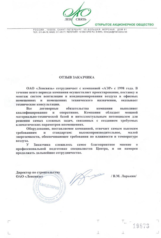 ОАО «Ленсвязь» сотрудничает с компанией «АЭР» с 1998 года. В течение всего периода компания осуществляет проектирование, поставку, и монтаж систем вентиляции и кондиционирования воздуха в офисных помещениях и помещениях технического назначения, оказывает технические консультации.
