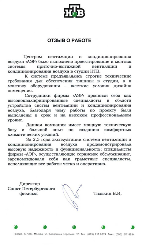 За 2,5 года эксплуатации система вентиляции и кондиционирования воздуха продемонстрировала высокую надежность и функциональность; специалисты фирмы «АЭР», осуществляющие сервисное обслуживание, зарекомендовали себя как грамотнее специалисты, исполняющие все работы четко и оперативно.