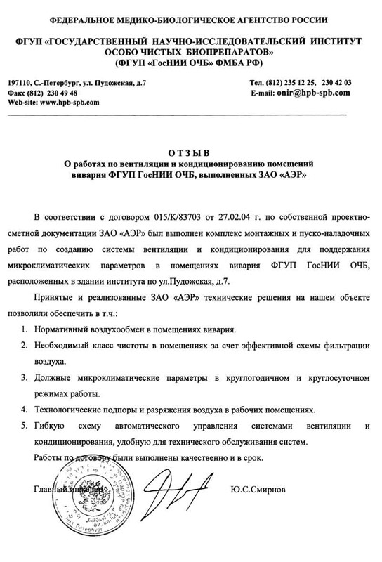 В соответствии с договором 015/К/83703 от 27.02.04 г. по собственной проекто-сметной документации ЗАО «АЭР» был выполнен комплекс монтажных и пуско-наладочных работ по созданию системы вентиляции и кондиционирования для поддержания микроклиматических параметров в помещении вивария ФГУП ГосНИИ ОЧБ, расположенных в здании института по ул. Пудожская, д.7.
