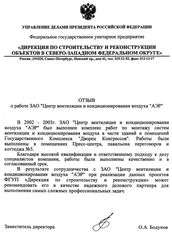 В результате сотрудничества с ЗАО «Центр вентиляции и кондиционирования воздуха «АЭР» при реализации данных проектов ФГУП «Дирекция по строительству и реконструкции» может рекомендовать его в качестве надежного делового партнера для выполнения самых сложных профессиональных задач.