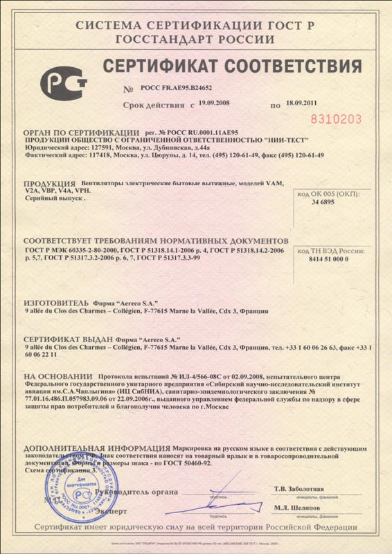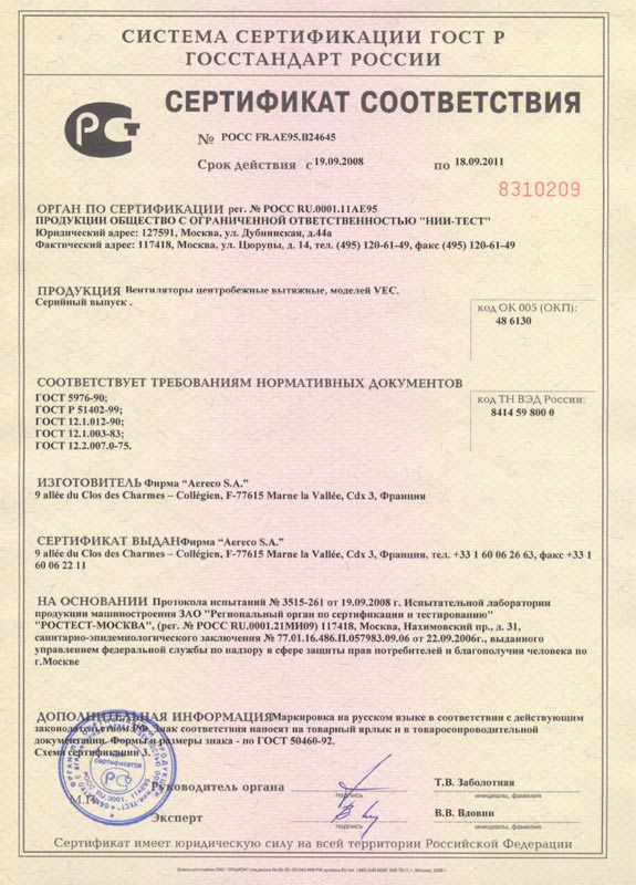 - Сертификат соответствия. Вентилятор VEC, Россия