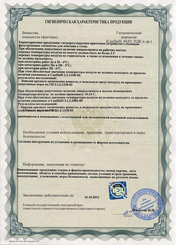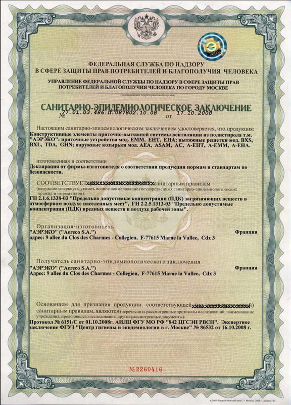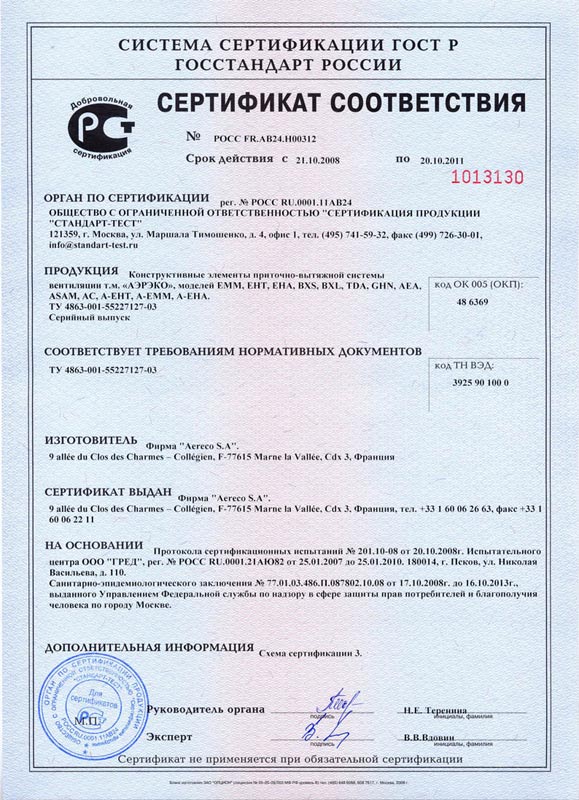 - Сертификат соответствия на конструктивные элементы приточно-вытяжной системы вентиляции, Россия