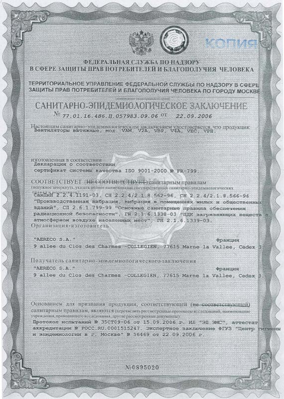 - Санитарно-эпидемиологическое заключение. Вентиляторы вытяжные, мод.: VAM, V2A, VBP, V4A, VEC, VPH, Россия, лист 1