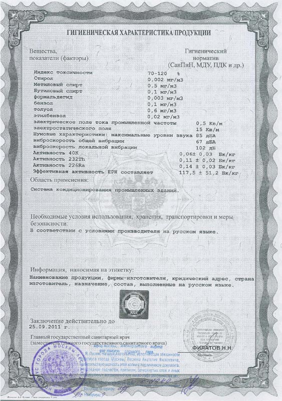 - Санитарно-эпидемиологическое заключение на конструктивные элементы приточно-вытяжной системы вентиляции, Россия, лист 1