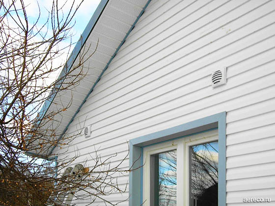 Установленные на фасаде коттеджа два настенных козырька A-EHT с сеткой от насекомых, закрывающие отверстия для стеновых приточных клапанов EHT.