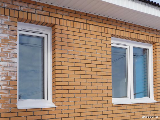 Внешний вид окон с установленными приточными устройствами ЕММ. Наружные козырьки защищают помещение от проникновения воды.