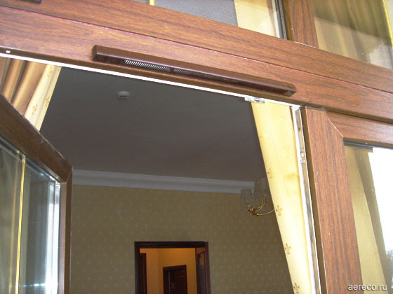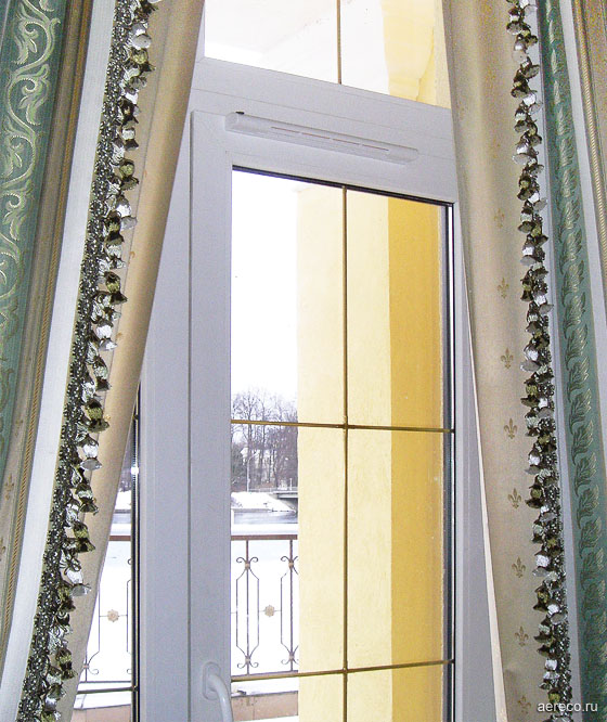 Приточный шумозащитный клапан EMM, установленный на балконную дверь.