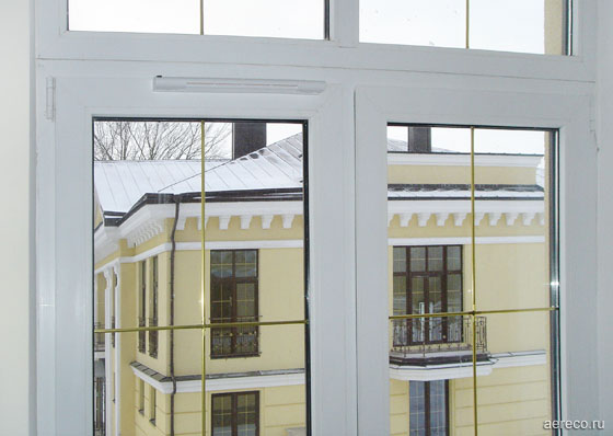 Внешний вид установленного на окне приточного устройства EMM. Не смотря на свои небольшие габариты, данное устройство обеспечивает приток воздуха до 35 м3/час при 10 Па.
