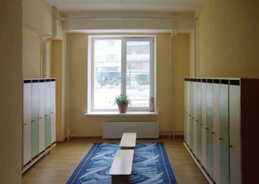Раздевалка. В верхней части окна установлен приточный клапан EMM, обеспечивающий приток воздуха до 35 м3/ч при 10 Па.
