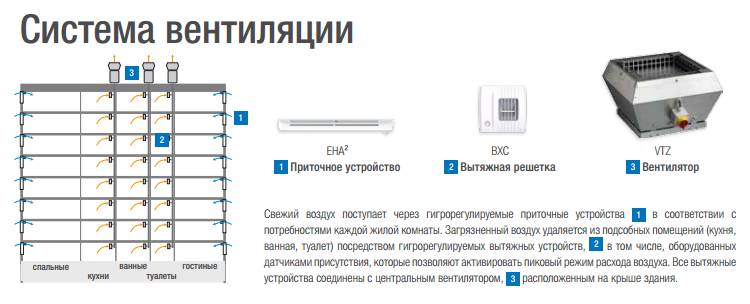 Для организации удаления загрязненного воздуха и обеспечения автоматической регулировки расхода воздуха в каждой квартире, были применены вытяжные решетки BXC, оснащенные датчиками, реагирующими на изменение относительной влажности воздуха внутри помещений, а также крышные вентиляторы VTZ с максимальной производительностью до 2.750 м3 /ч при 100 Па. Вентиляторы VTZ позволяют настраивать и поддерживать необходимый уровень давления, что гарантирует постоянный воздухообмен независимо от внешних условий (температура воздуха, ветро- вая нагрузка). Использование дополнительных шумоглушителей обеспечивает высокую звуко- изоляцию как от самого оборудования, так и каждой отдельной квартиры от внешнего уличного шума.