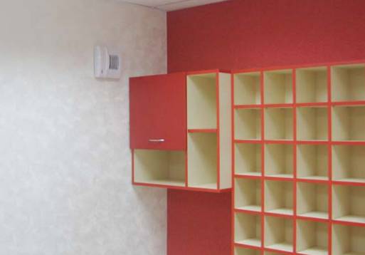 Гигрорегулируемые приточные клапаны (оконный - EMM, стеновой - EHT), установленные в парикмахерском зале. Подобное сочетание позволяет добиться лучшего воздухообмена (до 75 м3/ч) при ограниченных монтажных возможностях.
