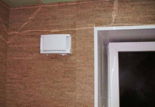 Стеновой приточный клапан EHT в интерьере комнаты, отделанной пробкой.