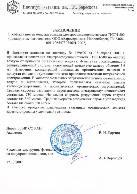 Заключение Института катализа им. Г.К. Борескова об эффективности очистки воздуха электровоздухоочистителем ТИОН-500