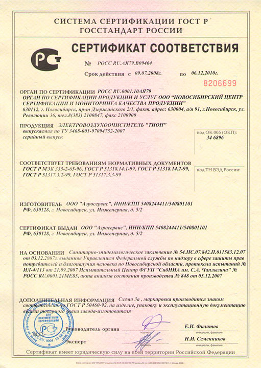 Сертификат соответствия госстандарта на воздухоочиститель ТИОН