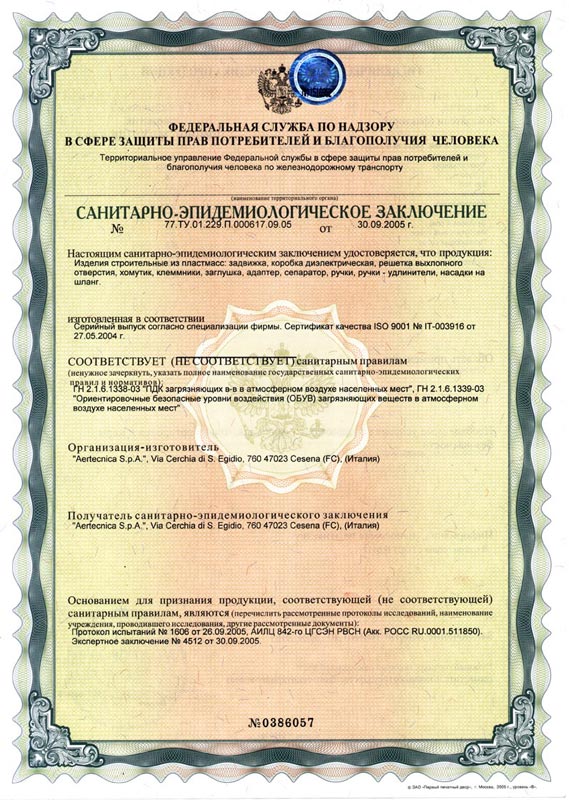 Санитарно-эпидемиологическое заключение на продукцию Aertecnica