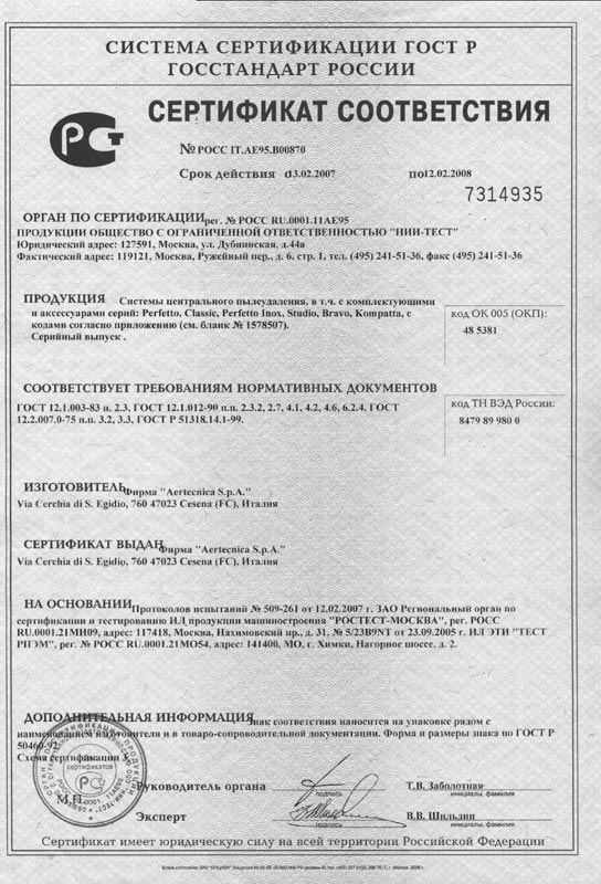 Сертификат соответствия госстандарта России на продукцию Aertecnica