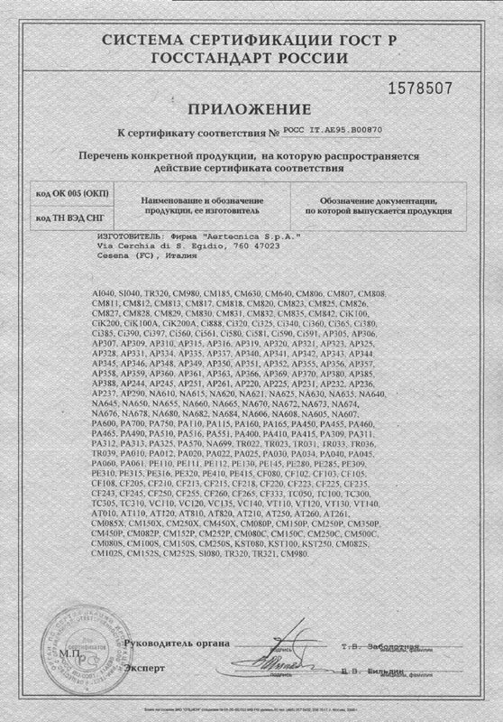 Сертификат соответствия госстандарта России на продукцию Aertecnica, приложение