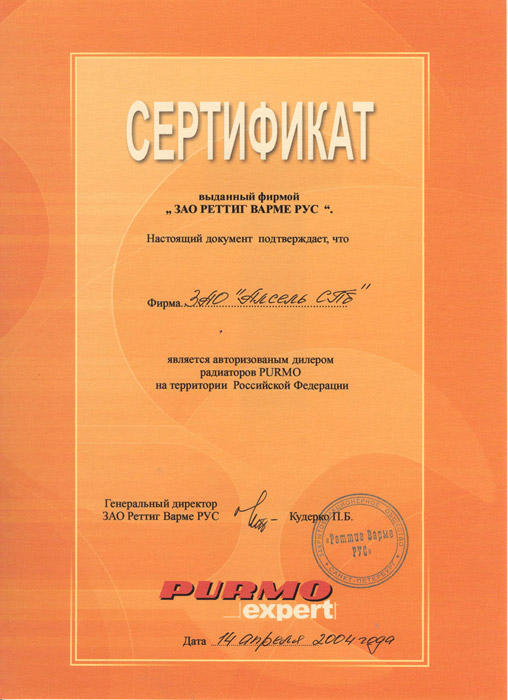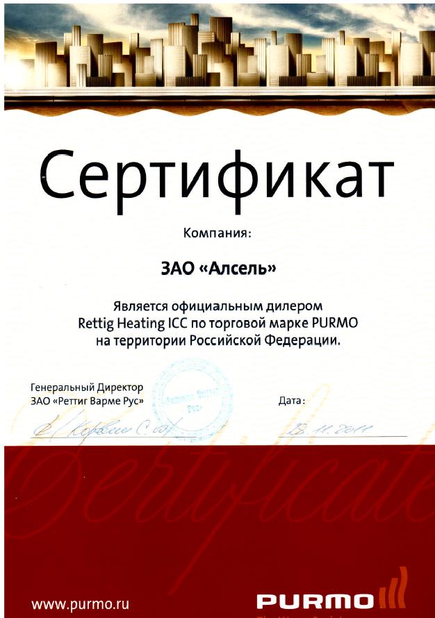 Сертификат официального дилера Rittig Heating ICC по торговой марке PURMO на территории РФ