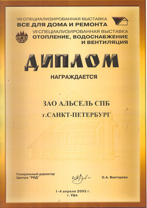 Диплом VII специализированной выставки «Отопление, водоснабжение и вентиляция»(Уфа, 2003)