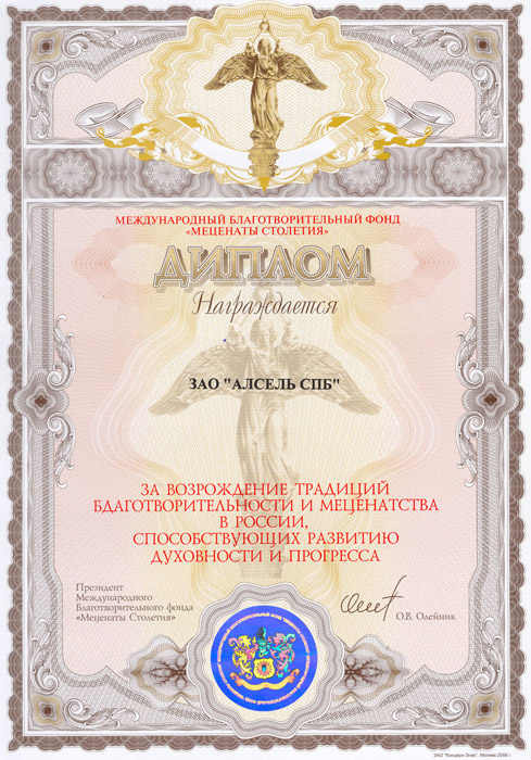 Диплом международного благотворительного фонда «Меценаты столетия»