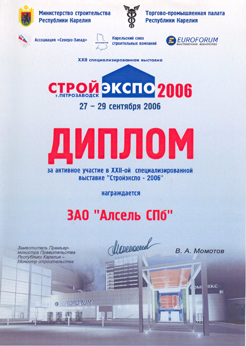 Диплом XXII специализированной выставки СтройЭкспо2006 (г. Петрозаводск)