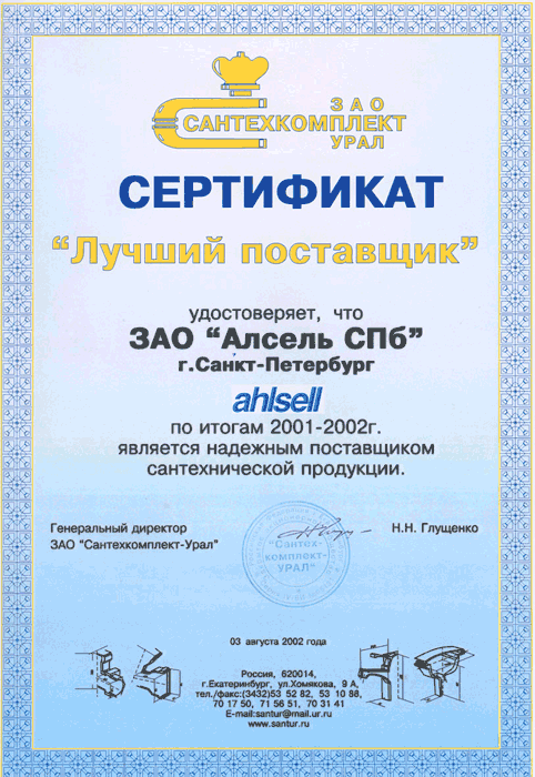 Сертификат лучшего поставщика Сантехкомплект-Урал