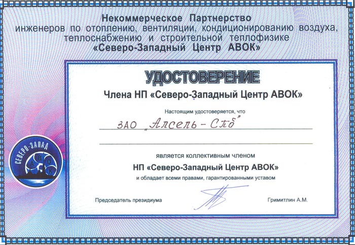 Удостоверение члена НП «Северо-Западный Центр АВОК»