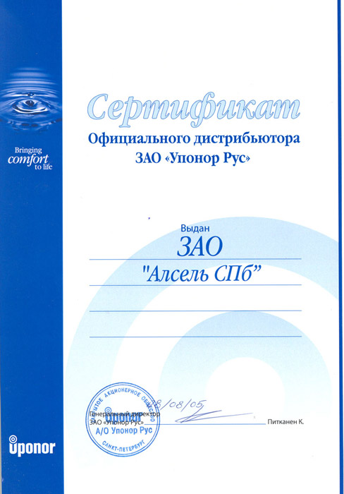 Сертификат официального дистрибьютора марки SYSTEM KAN-therm в России