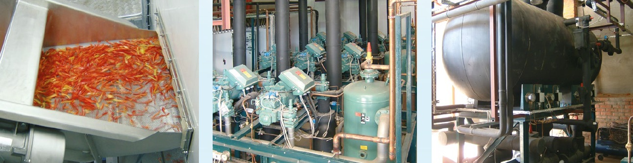- поставка и ввод в эксплуатацию низкотемпературной установки, выполненной по насосно– циркуляционной схеме, используемой для холодоснабжения флюидизационных шокфростеров фирмы «Frigoscandia» FFS3 и FFS2, а также туннельного скороморозильного аппарата;