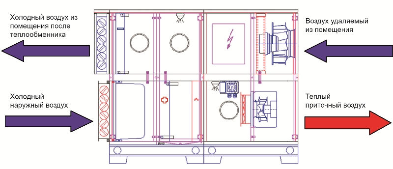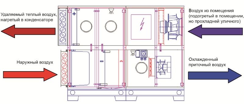 Принцип работы центральных кондиционеров со встроенной холодильной установкой заключается в том, что в приточной части располагается испаритель, охлаждающий приточный воздух, который потом подается в помещение. При этом отводимое тепло выбрасывается наружу через вытяжную часть установки, в которой располагается конденсатор. В холодный период года происходит переключение в режим теплового насоса, и тепло забирается у теплого влажного вытяжного воздуха и отдается приточному воздуху.